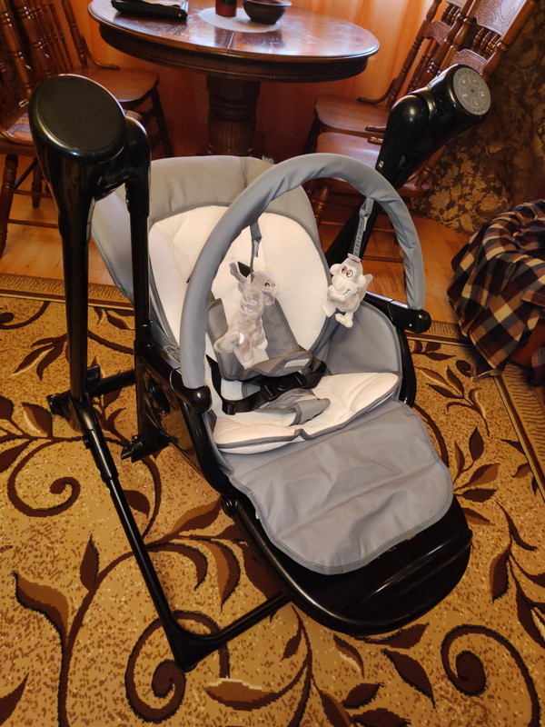 Спали мы частенько в стульчике для кормления, с помощью таймера, мелодий, а еще и качелей, время засыпания у нас сводилось к минимуму. У качелей бесшумный маятниковый механизм, с ним укачивания малыша происходило плавно и равномерно. В стуле есть разъем для флешки, таким образом мы слушали сказки, рассказы о природе, да и звуки птичек. У стула есть электронный блок управления, пульт, что идет в комплекте, помогает удаленно управлять функциями. С регулировкой высоты стула, нуовиту можно подогнать под любой стол. А колесики облегчают передвижение по дому, не важно, что у нас за покрытие дома, колесики преодолевают любое препятствие.